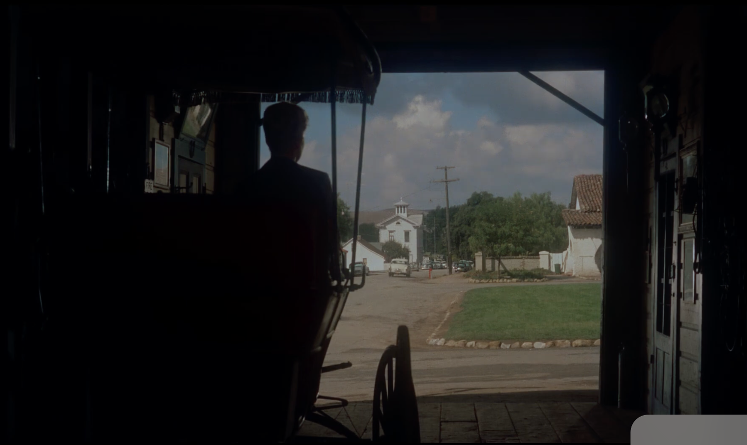For most of the shot Scottie remains within the dark interior of the barn, only entering the light at the final second as he exits the frame. Judy’s absence continues to dictate his behavior, reinforcing the idea that she still holds narrative power. Even when Scottie moves toward the light, it is because Judy has compelled him to follow.