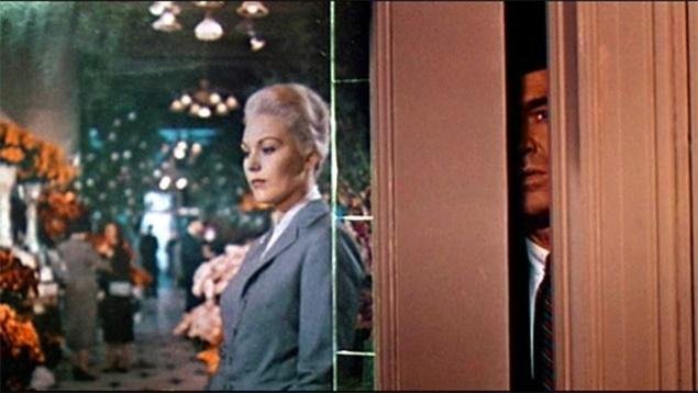 One of the earliest and most explicit examples of this staging dynamic occurs when Scottie follows Judy into a flower shop and observes her through a partially opened door.