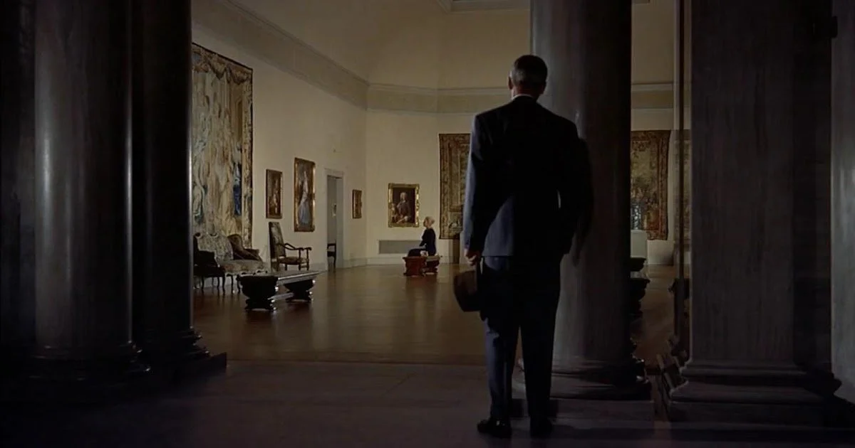 At the beginning of the shot, Scottie stands in a dim hallway with his back to the camera. He watches Judy from a distance as she sits centered in the brightly lit gallery. The museum room is filled with colorful paintings illuminated by strong lighting, while the hallway where Scottie stands remains shadowy and subdued.